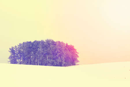 Winter landscape scrap of forest on a snowy field. Colorful colors with purple hues.