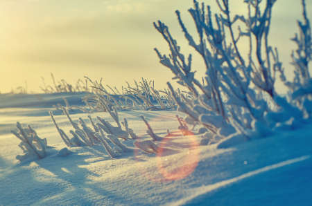Winter nature background with frozen branches in snow and sunlight