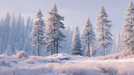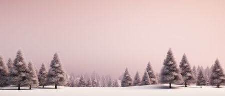 A breathtaking winter scene featuring tall evergreen trees blanketed in fresh snow beneath a soft pink and purple sky, evoking a serene and tranquil atmosphere.