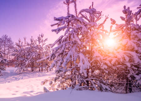 Nature winter landscape. Snowy forest during sunset. Pine trees covered with snow. Winter nature. Christmas background