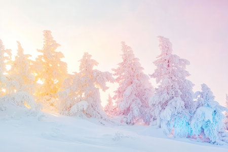 Frozen trees on a snowy hill at sunrise. Pastel colors and a tranquil atmosphere.