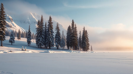 A serene winter landscape with snow-covered trees, a glowing sun setting in the background, and a soft mist creating an ethereal atmosphere. --ar 5:2 --v 6.1 Job ID: 7838e9bd-ee1d-4895-bd14-90833bd784cd