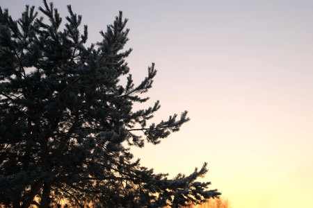 Huge coniferous tree in forest on sunset orange purple sky background in winter. Evening in nature park woodland outdoors. Frost cold day. Peaceful calm time.