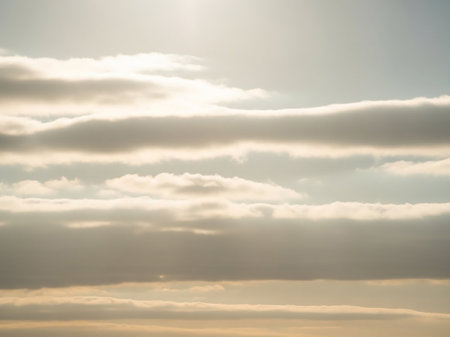 Gentle showing horizontal layers of soft white and grey clouds illuminated by warm sunlight creating a serene and expansive sky backdrop keywords: sky, clouds,...