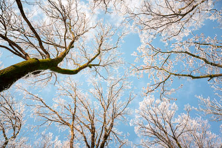 Low angle view of the old city park after a blizzard, tree trunks close-up. Hoar frost on branches. Clear blue sky