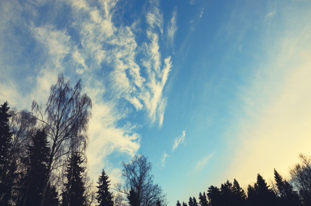 Blue sky background with beautiful bright clouds.Trees in forest.Winter scenery.Treetops.