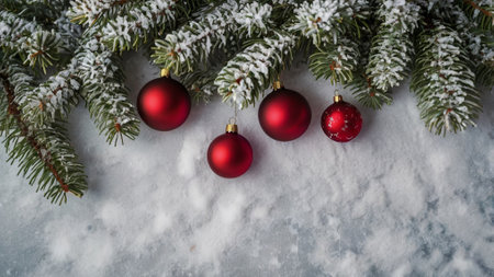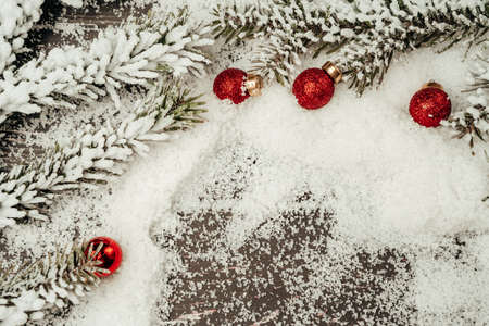 Christmas greeting card. Festive decoration on snow. New Year concept. Copy space. Flat lay. Top view.