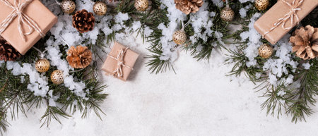 Blurred winter and Christmas background with snowy pine branches and abstract golden lights in a festive holiday scene. Horizontal banner with winter design and space for text.