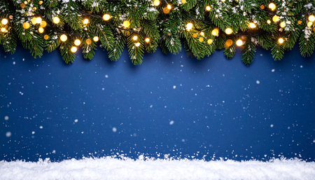 Festive evergreen boughs with warm fairy lights dusted with faux snow against a deep blue background, creating a winter wonderland scene ideal for holiday greetings