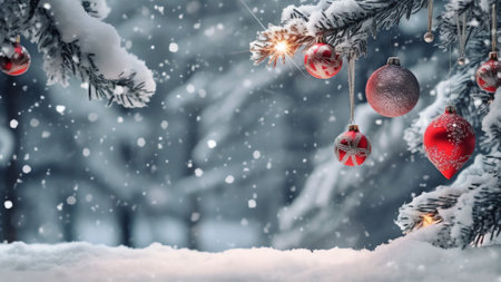 Generative AI : Beautiful Festive Christmas snowy background Christmas tree decorated with red balls and knitted toys in forest in snowdrifts in snowfall outdoors banner format cop