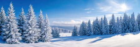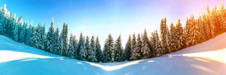 Winter landscape with snow covered fir trees and blue sky. Panorama.