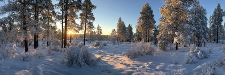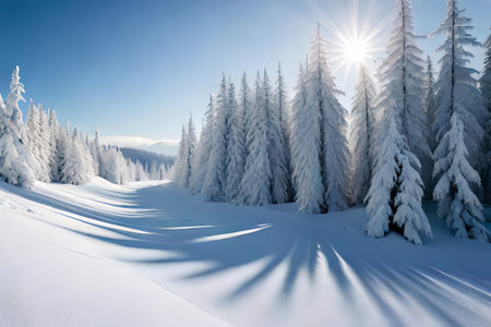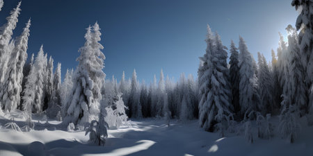 An expansive snow-covered landscape showcases a forest of evergreen trees. The scene is illuminated by soft sunlight and a clear blue sky. The composition features a symmetrical arrangement, with a focus on natural elements. This image could be used for various commercial projects related to nature, travel, or seasonal themes.