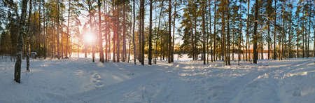 A panoramic view of a snow-covered forest, bathed in the soft light of dawn. The trees are heavily frosted, and the air is filled with a mist.