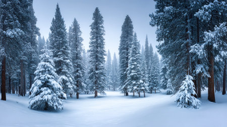 A peaceful winter forest blanketed in snow welcomes the holiday season. Tall trees stretch upward basking in soft sunlight as nature rests.