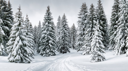 Experience a serene snowy landscape featuring a winding path through towering evergreen trees, blanketed in fresh snow underneath a soft, cloudy sky.