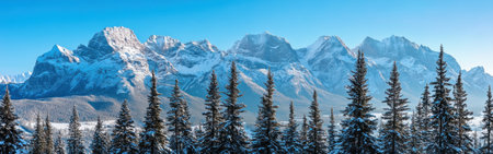 Snow-draped peaks tower majestically over dense evergreen trees, creating a breathtaking winter scene bathed in bright midday light, highlighting nature's beauty.