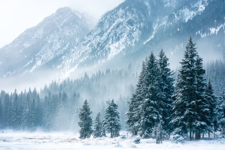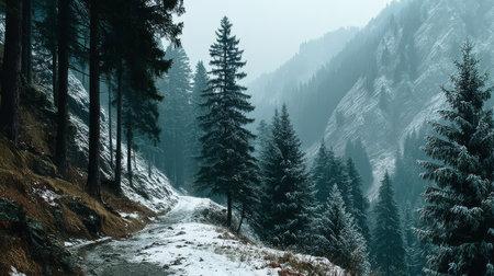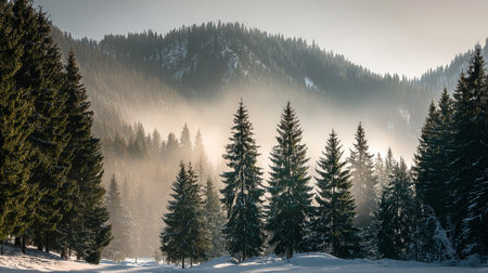 Misty Mountain Majesty: A Winter Forest Landscape with Coniferous Trees