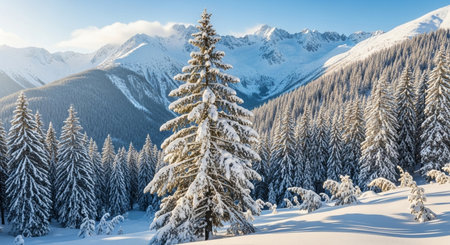 Beautiful winter landscape with snowy fir trees and mountains in the background