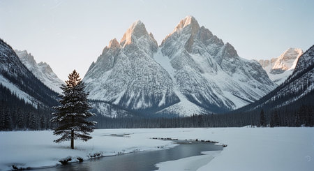 Beautiful winter landscape with snow-capped mountains and frozen lake