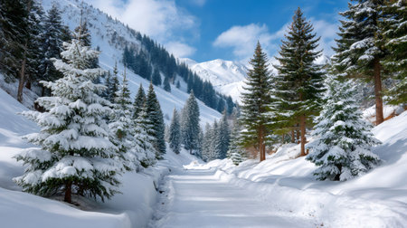 Snow blanketed mountain path through a forest of pine trees under a clear winter sky