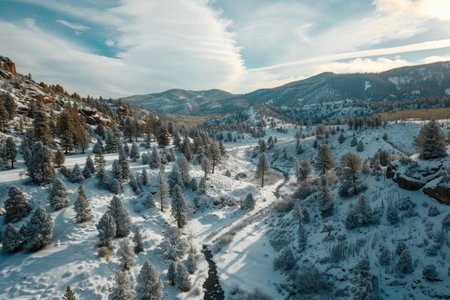 AI Generated. Drone shot of a snowy valley over spruce trees