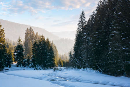 winter landscape with mountain river. coniferous forest on a snow covered shore. wonderful nature scenery in morning light. bright sunny weather with clouds on the sky. hazy atmosphere