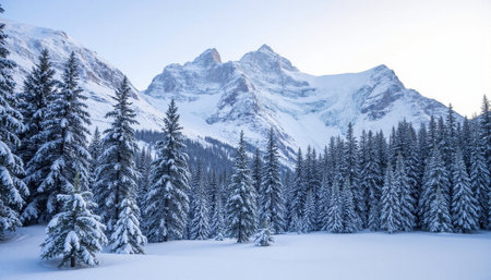 A stunning winter landscape showcasing majestic snow-covered mountains framed by vibrant evergreen trees, creating a serene and tranquil atmosphere.
