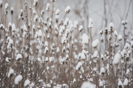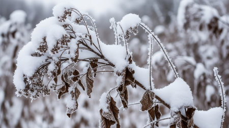Close-up view of frost-covered plants in a winter field. Serenity and peace.
