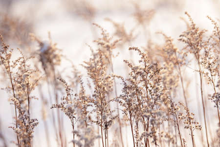 Dry branches of grass and flowers on a winter snowy field. Seasonal cold nature background. Winter landscape details. Wild plants frozen and covered with snow and ice in meadow.