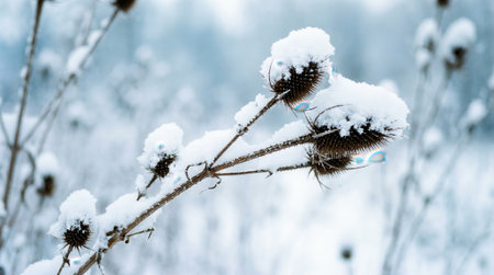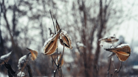 Frozen Pods With Falling Snow, Chilled Landscape Featuring Seed Pods Blanketed By Gentle Snowflakes . Media