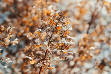 Dry golden hydrangea or hortensia flowers in sunlight, evening light