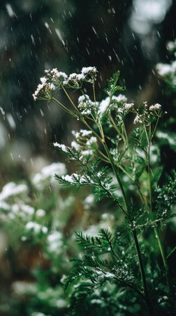 First snow falling gently on Cumin, a few snowflakes drifting slowly and settling on the leaves; fresh air, natural.