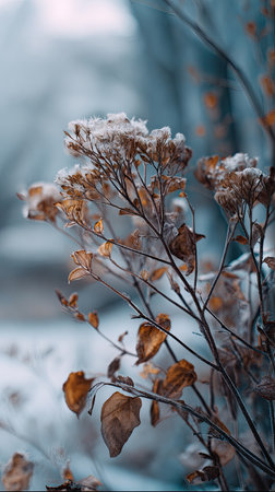 A close up of delicate umbellifer flowers coated in sparkling white frost. The background is a soft focus, cold blue winter landscape, creating a serene and tranquil mood.