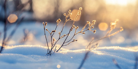 Delicate wildflowers covered in frost glisten in the morning sun. This tranquil winter scene captures the beauty and stillness of nature during a cold season.