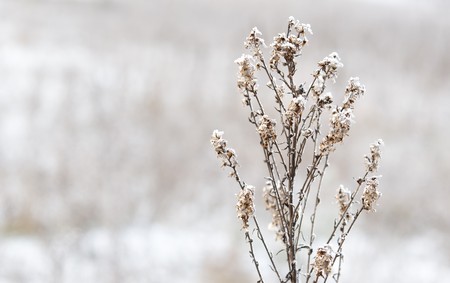 Rime on plants. Close up of plant with beautiful hoarfrost, soothing tones and colors.