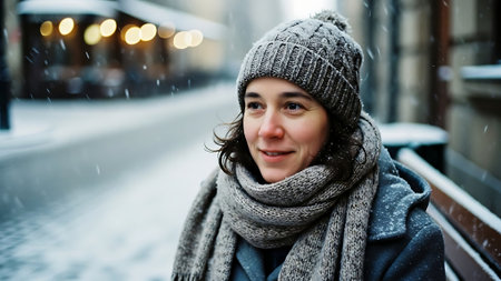 A young woman enjoying a snowy evening among city lights during the winter season