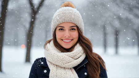 A young woman walking in a snowy park during winter, wearing a cozy sweater and a knitted hat, with snowflakes falling around her