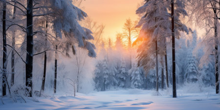A breathtaking sunrise illuminates a snow-covered forest, creating a magical winter scene.