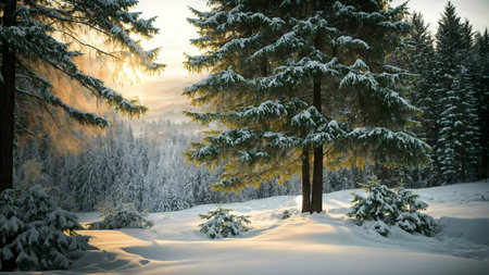 Silhouetted snow-laden pine branches at sunset. Golden light filters through the trees creating a magical winter scene.