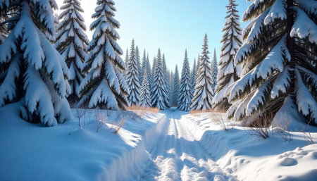 A tranquil winter scene with snowcovered trees against a bright blue sky and soft clouds floating above