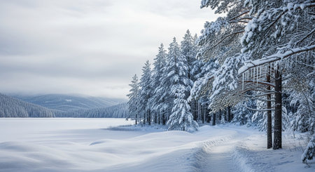 A serene winter landscape with a frozen lake reflecting the snowy trees and the clear sky.