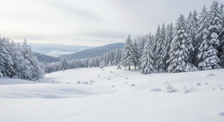 Winter wonderland: Snow-covered hills with bare trees and evergreens