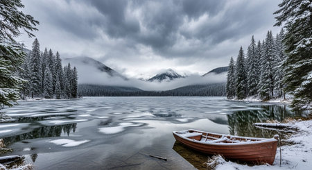 A serene, frozen lake enveloped in snow, with a canopy of frost-covered evergreen trees reflecting on the icy surface.