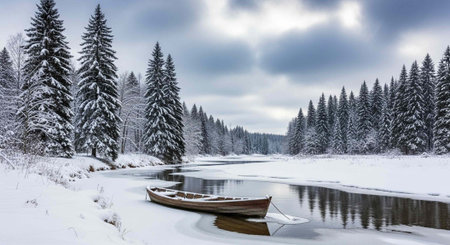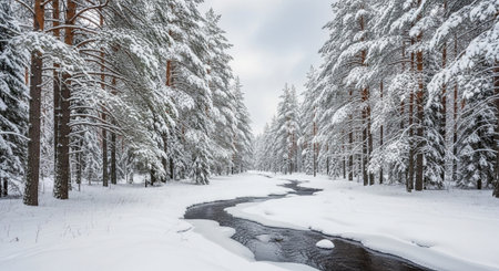 Beautiful winter landscape in the forest with a river and snow covered trees