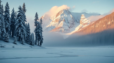 Beautiful winter landscape with snow covered mountains and frozen lake in the morning