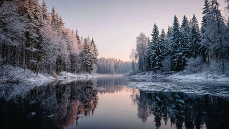 A serene winter landscape with a frozen river, snow-covered forest and sparkling ice. The blue tones and stillness create a peaceful atmosphere.