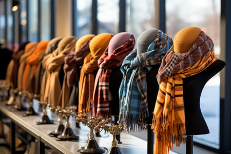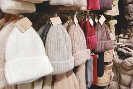 Cozy Winter Hats Displayed in a clothing Store. Concept of fashion accessories, warm clothing, shopping for winter, and colorful knitwear. Copy space.
