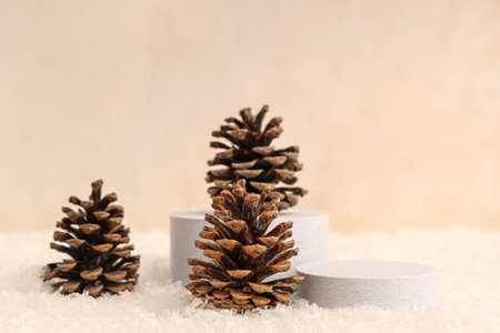 Decorative snow, plaster podiums and pine cones on beige grunge background