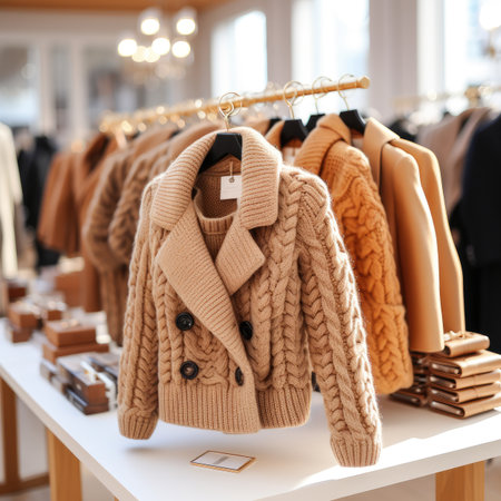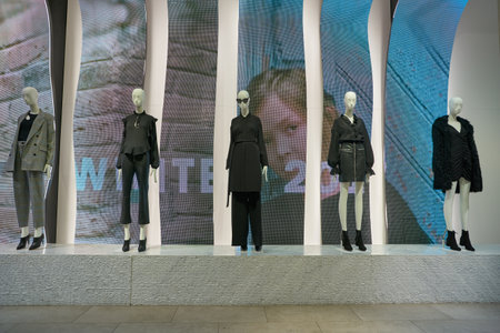 Elegant modern women's store interior featuring stylish winter fashion and glass display cabinets