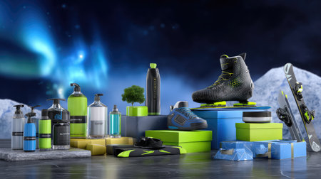 A stunning arrangement of modern sports equipment and accessories, showcasing vibrant colors and creative packaging against a scenic backdrop. Perfect for marketing and outdoor themes.